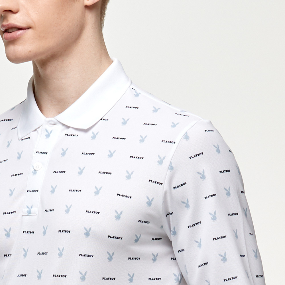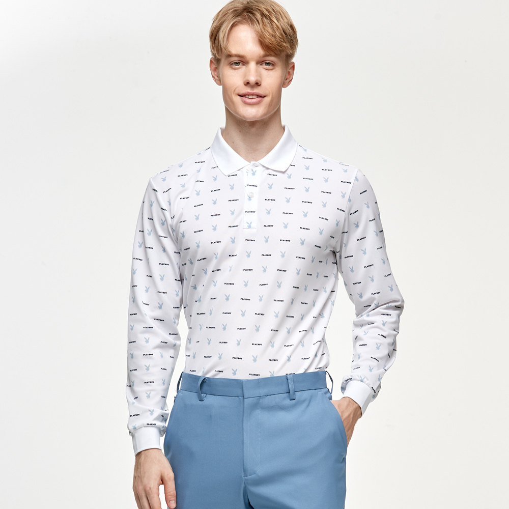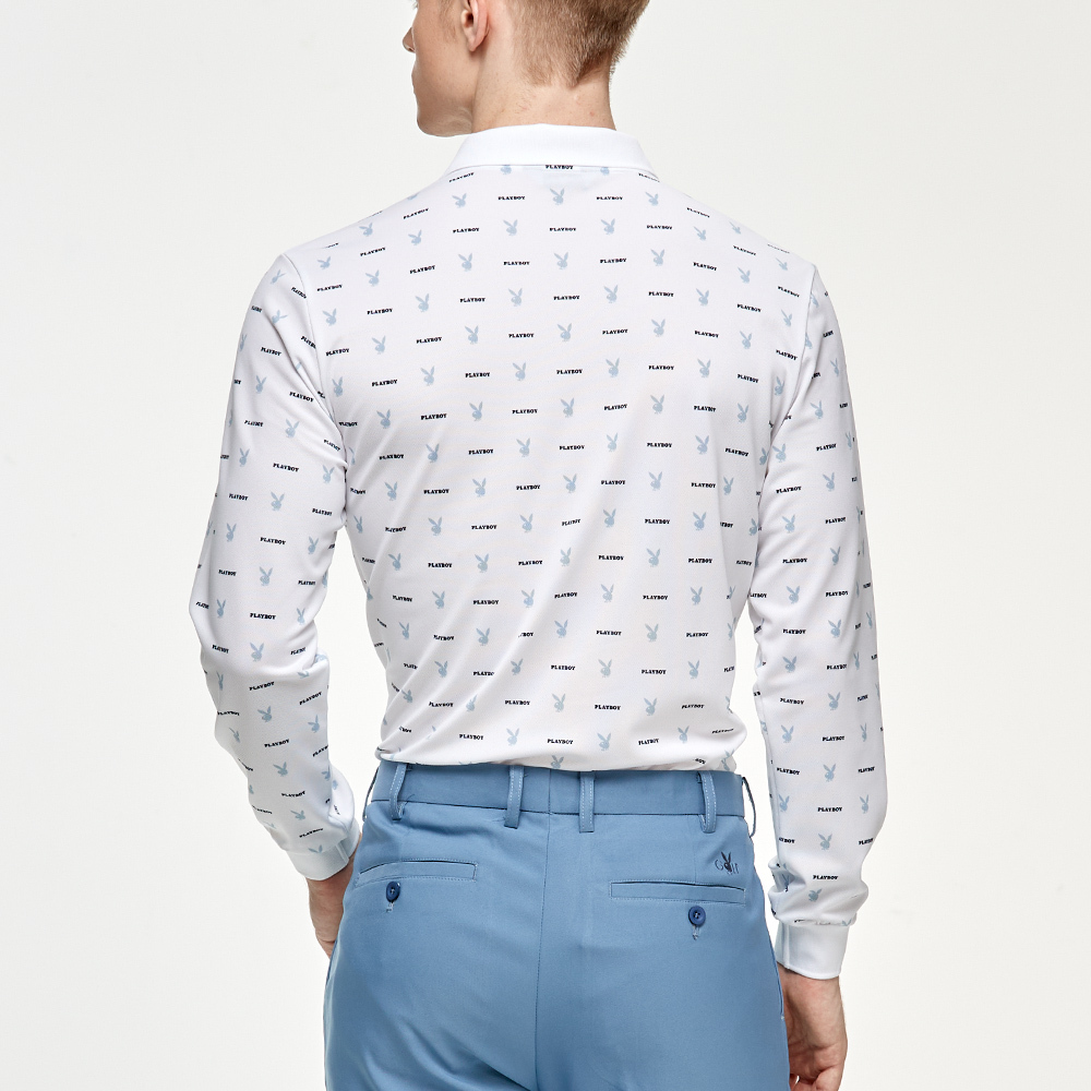 【PLAYBOY GOLF】男款LOGO兔頭印花高爾夫薄長袖POLO衫-白 / AA24209-87
