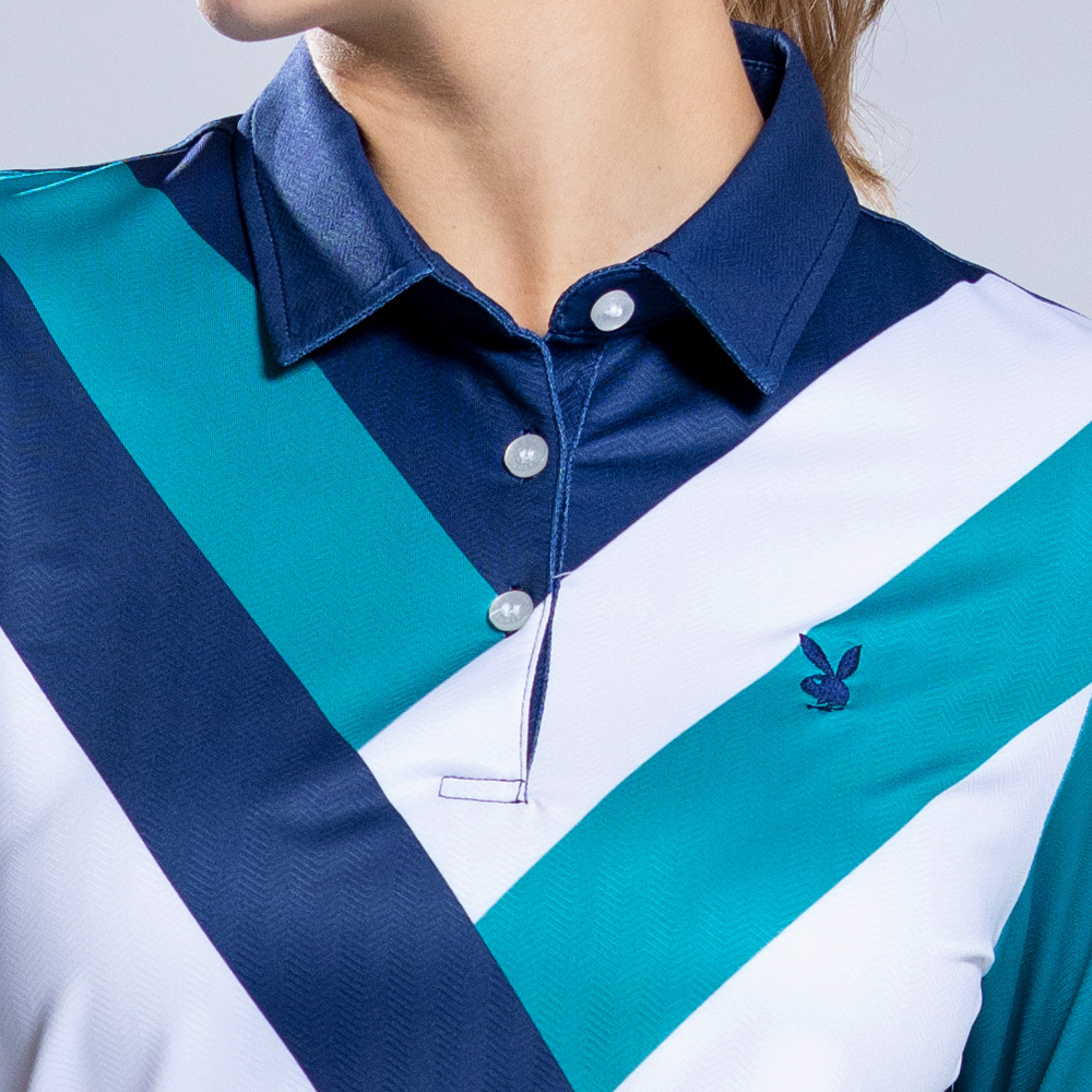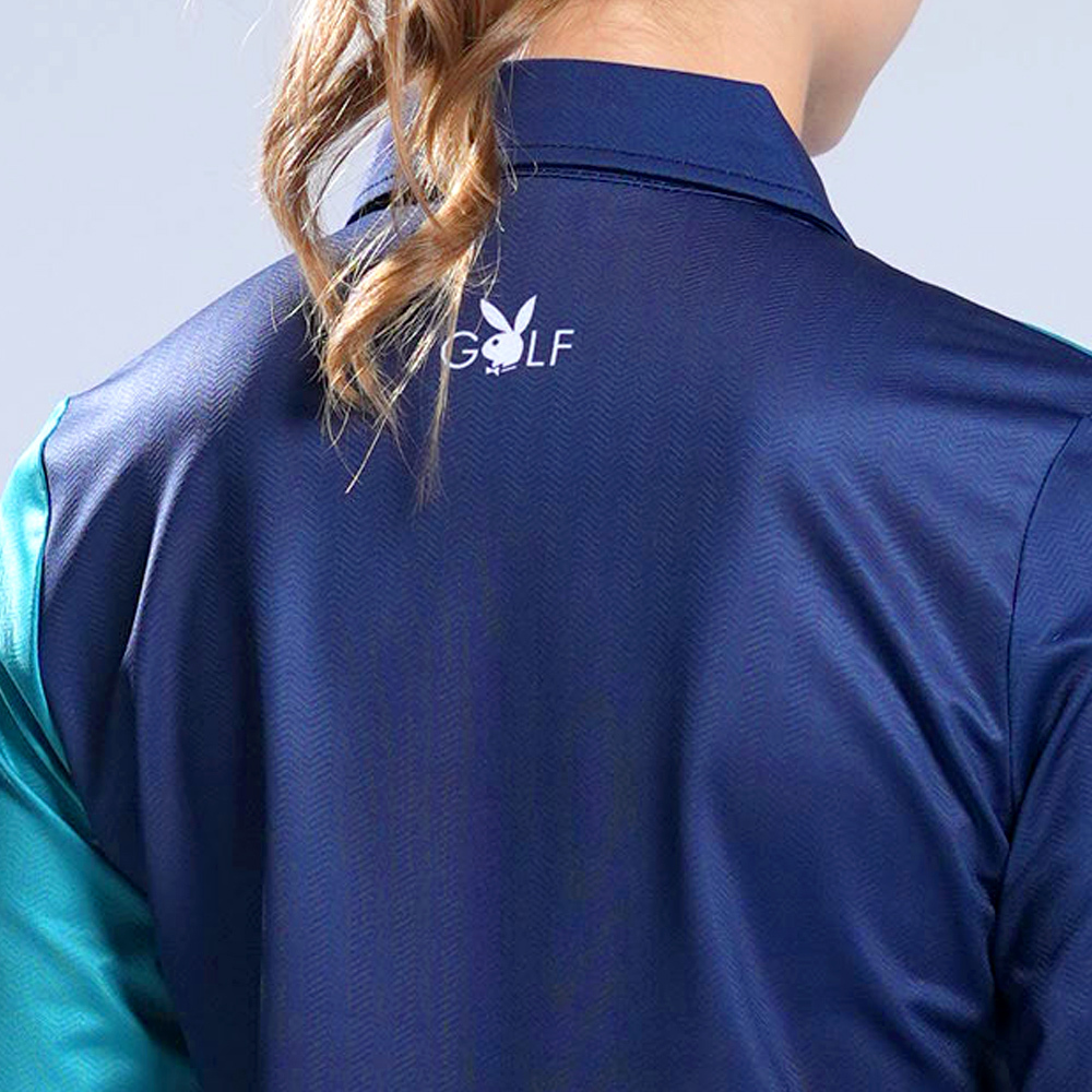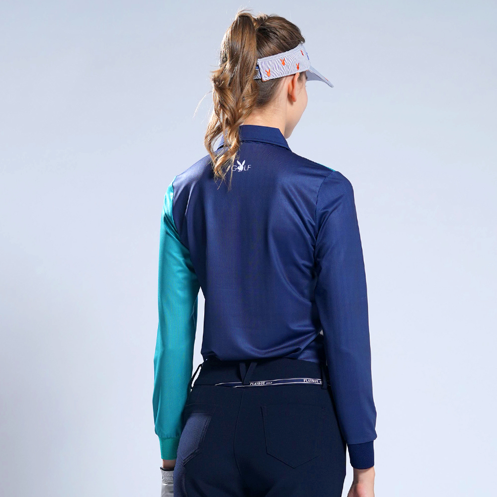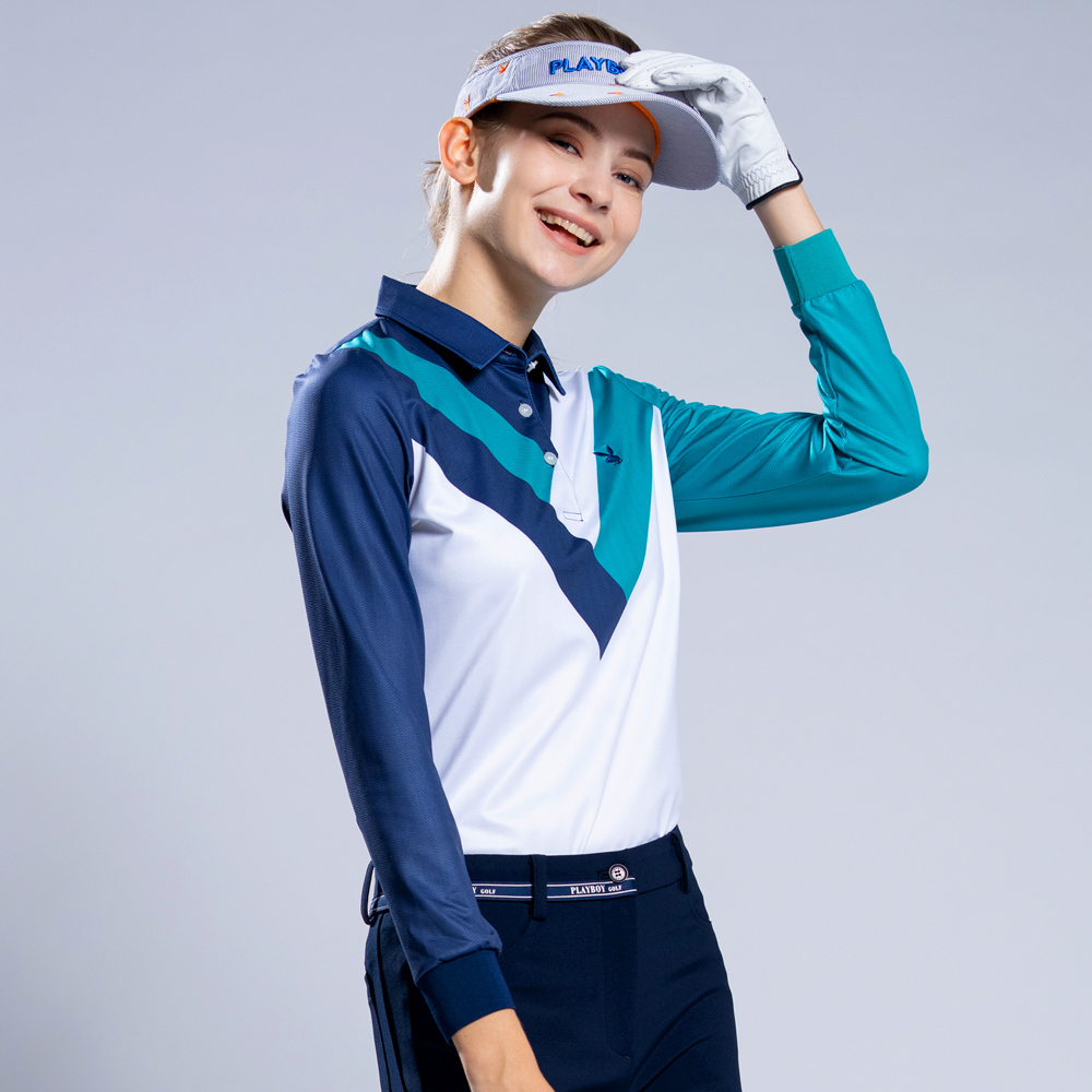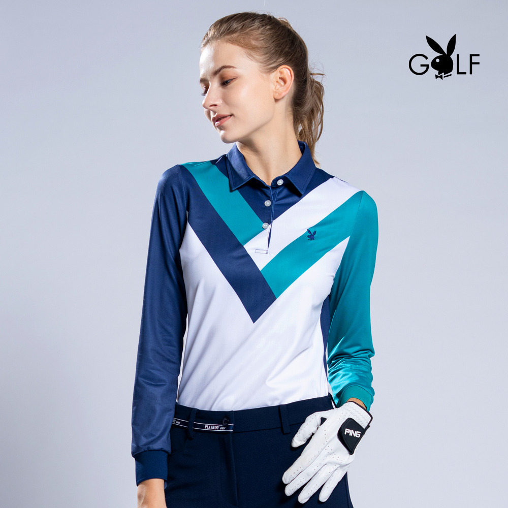 【PLAYBOY GOLF】女款V型配色薄長袖POLO衫-藍 / KA22201-58