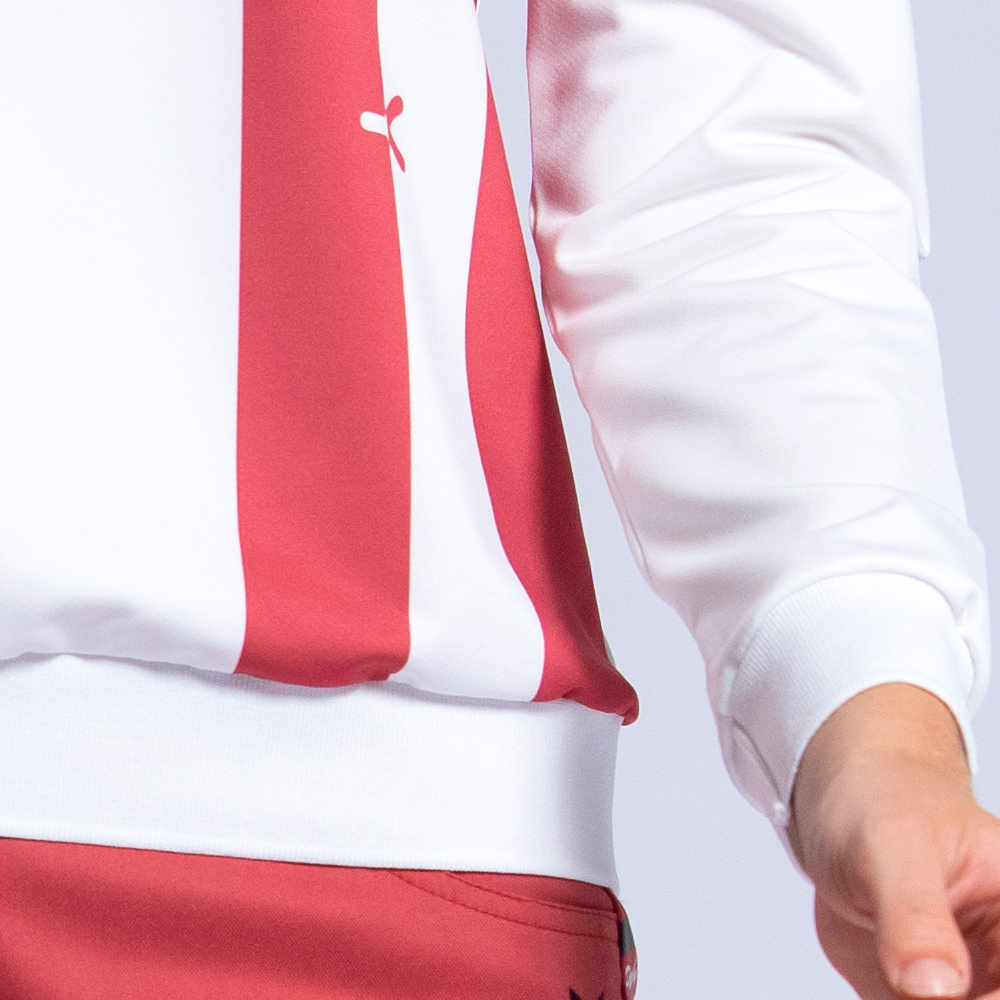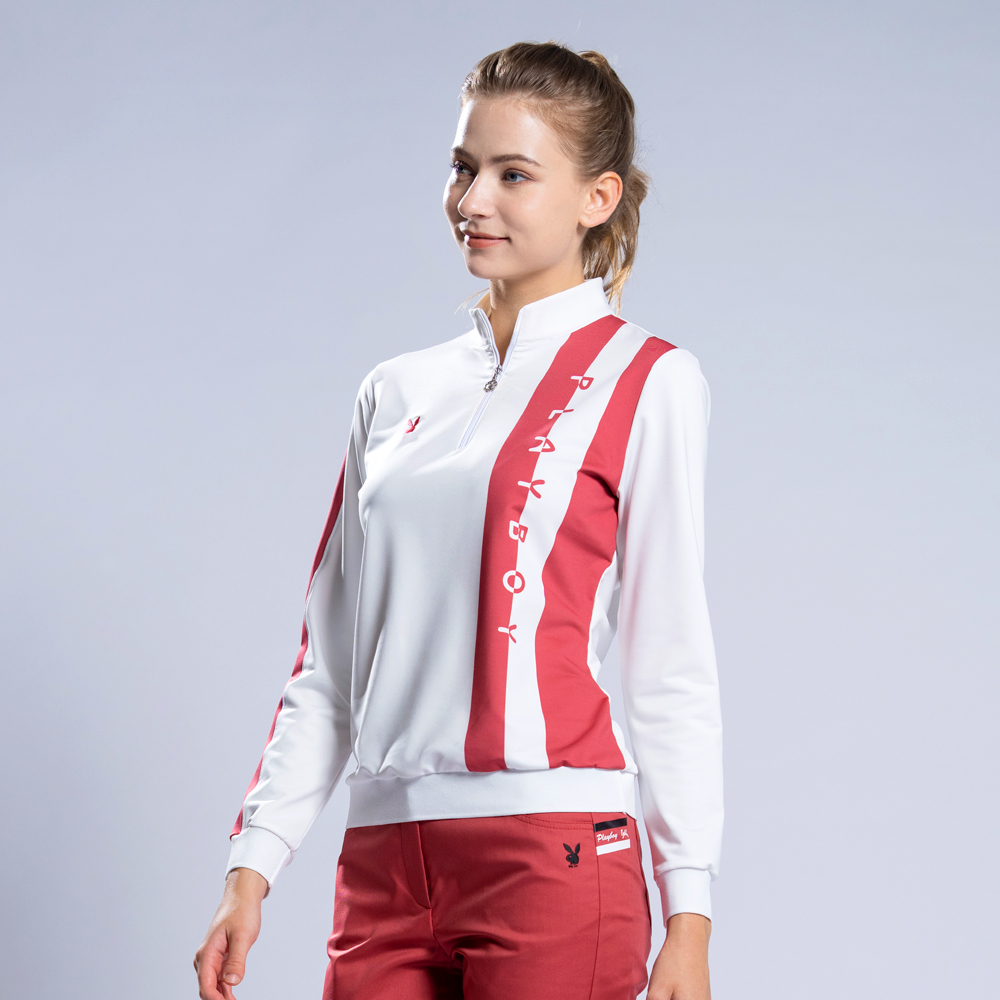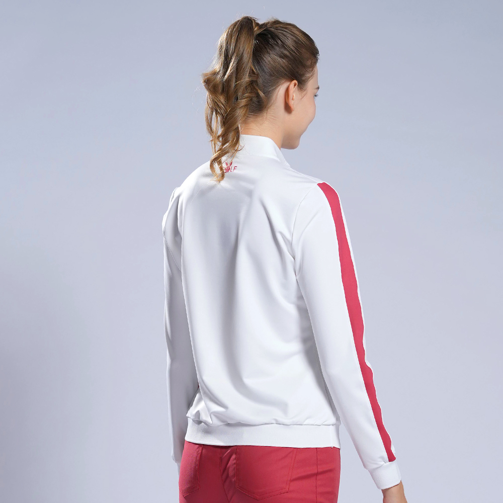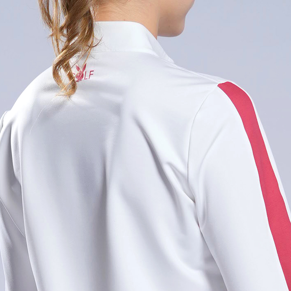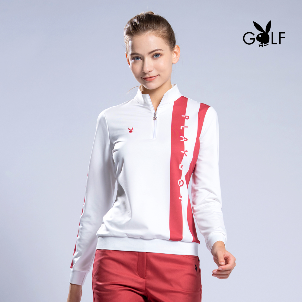 【PLAYBOY GOLF】女款單邊直條印花立領長袖POLO衫-白 / KA22220-73