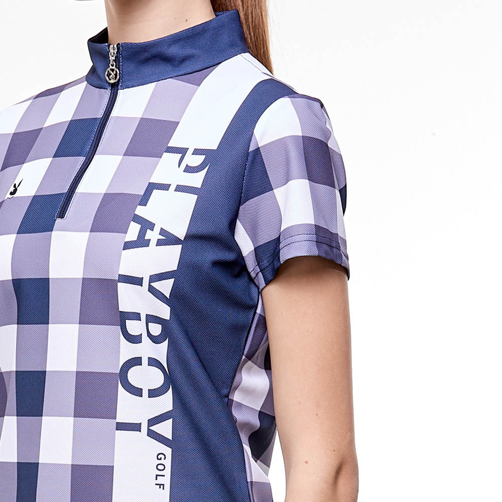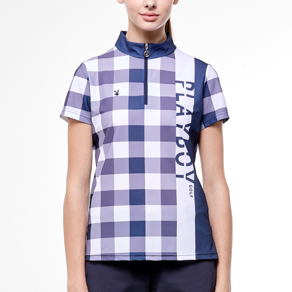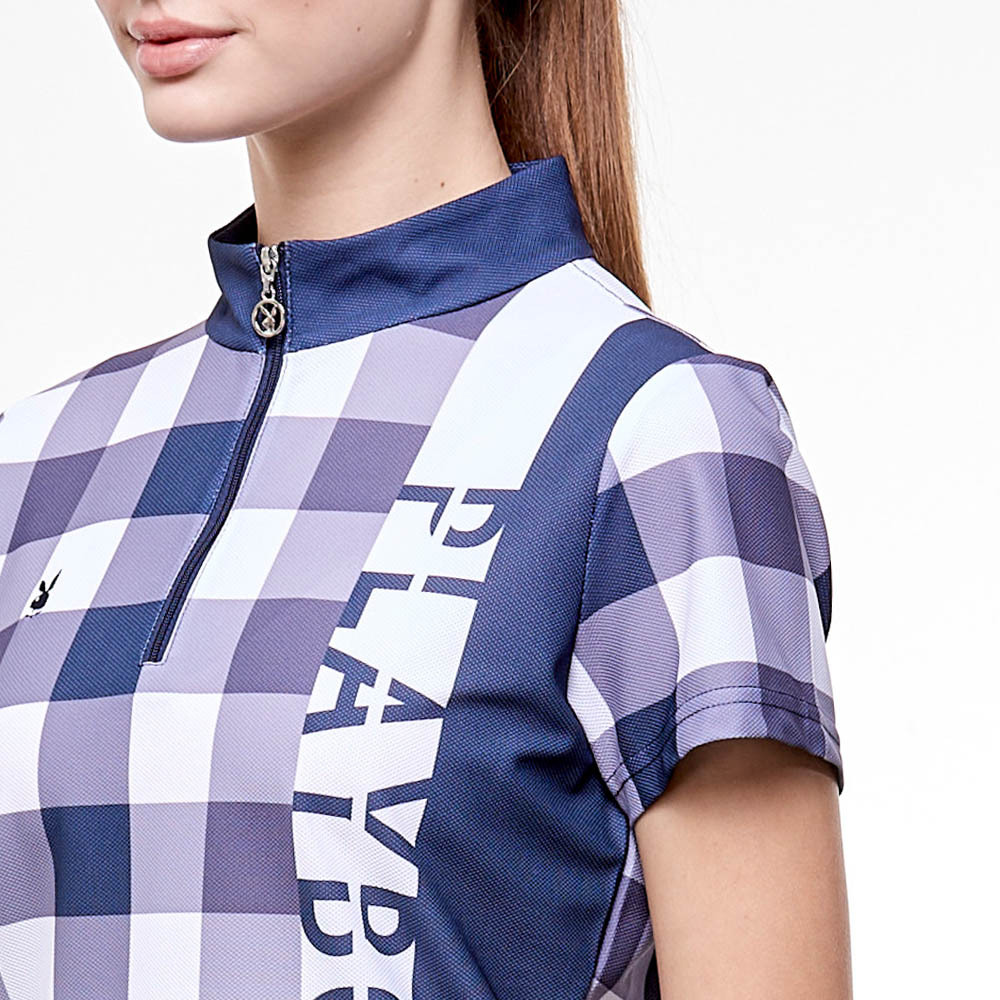 【PLAYBOY GOLF】女款方格吸濕排汗高爾夫立領短袖上衣-深藍 / KA24123-58