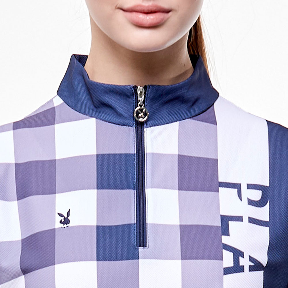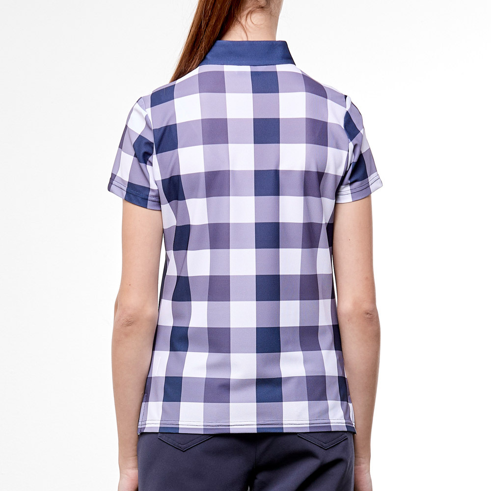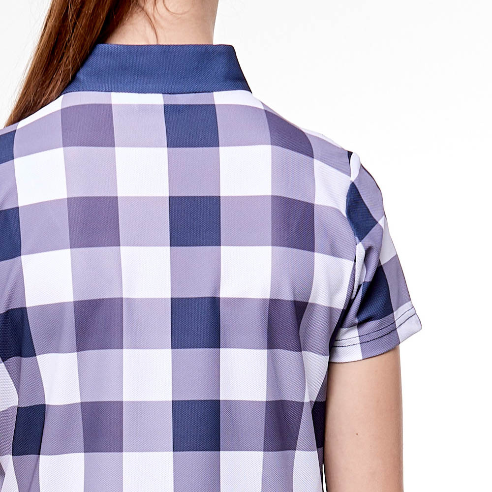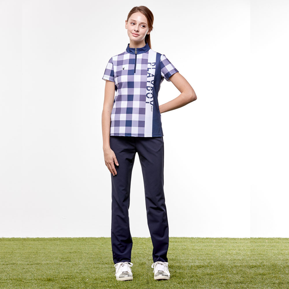 【PLAYBOY GOLF】女款方格吸濕排汗高爾夫立領短袖上衣-深藍 / KA24123-58