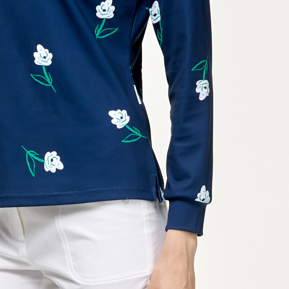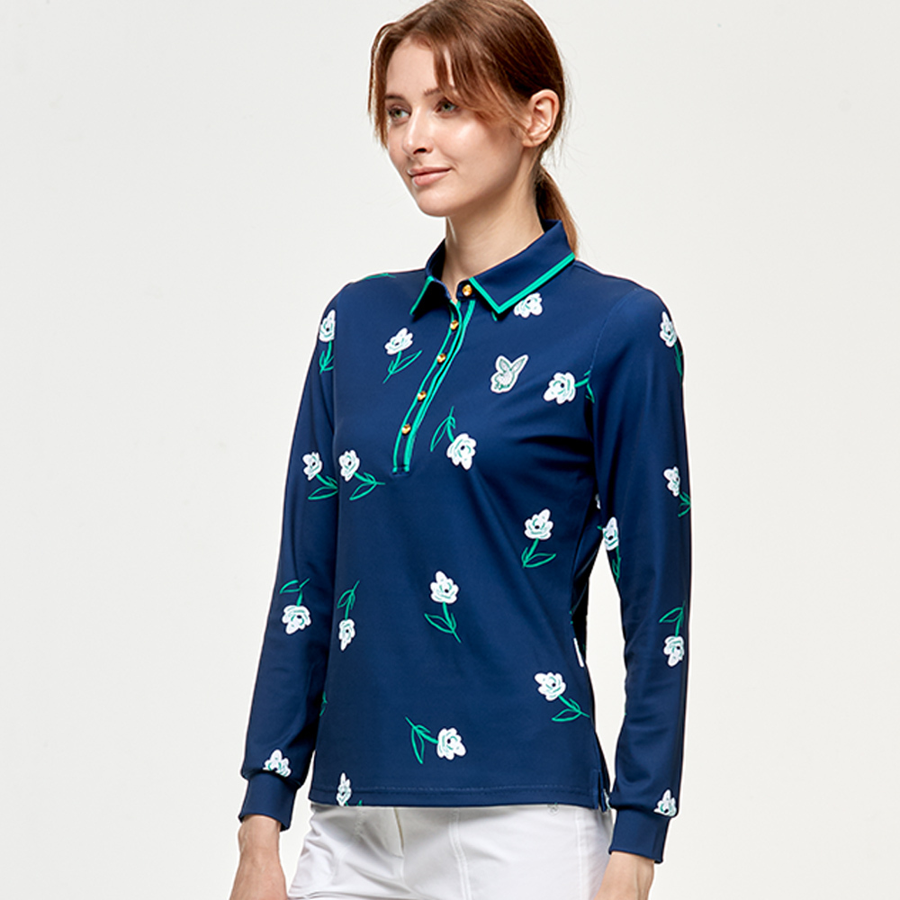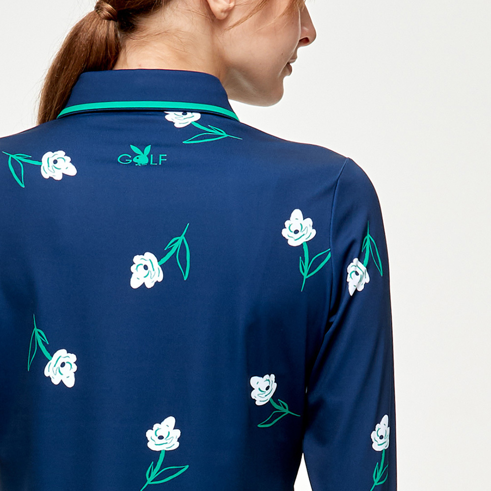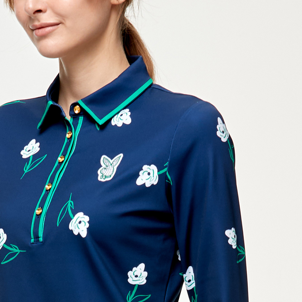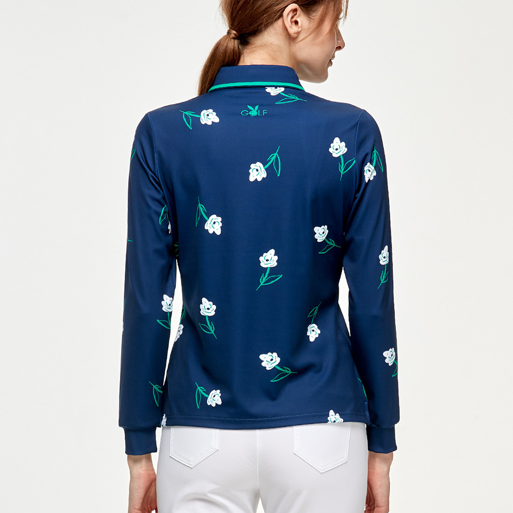 【PLAYBOY GOLF】女款花朵吸濕排汗高爾夫長袖POLO衫-深藍 / KA24211-58