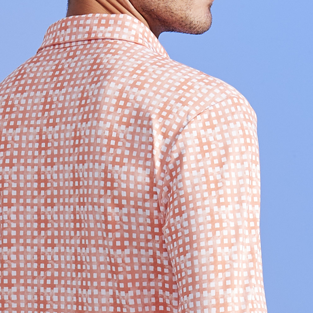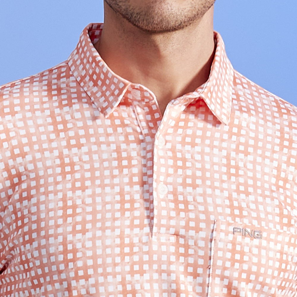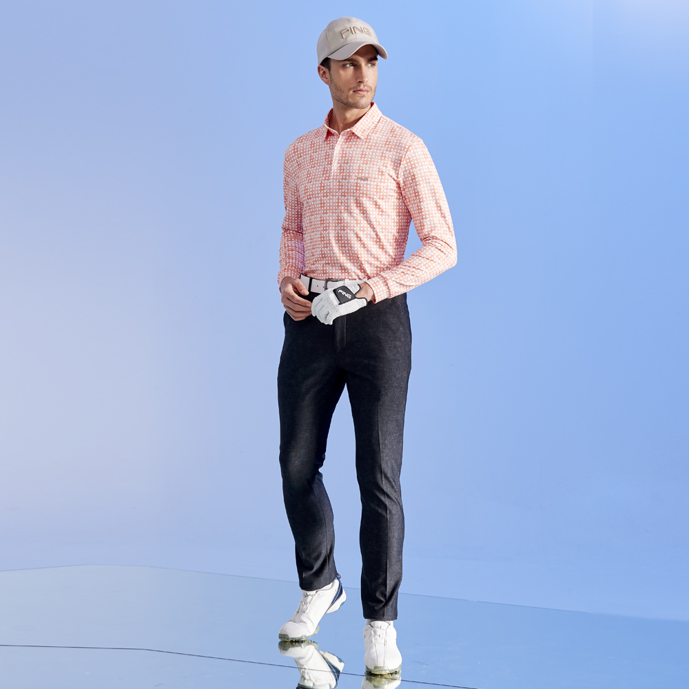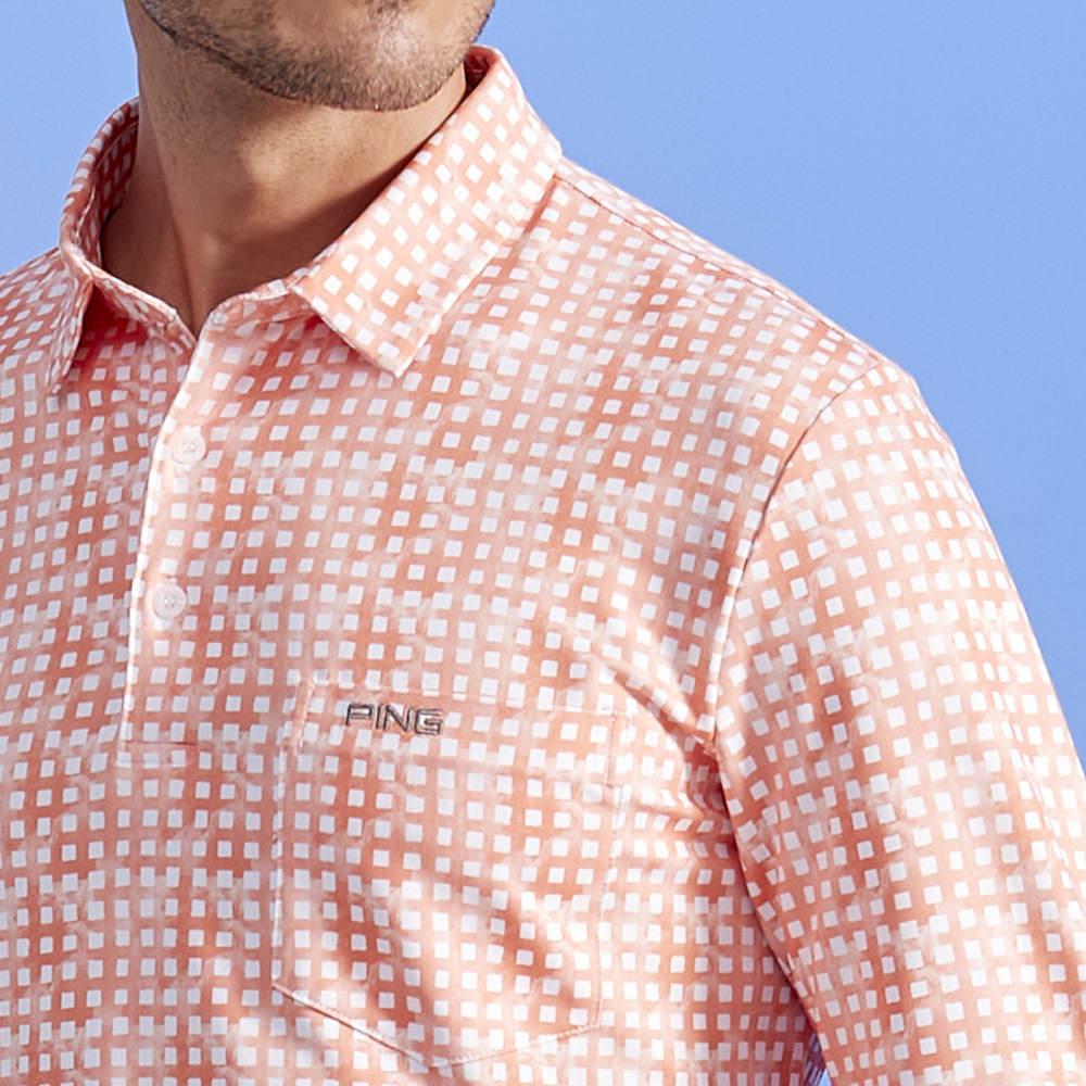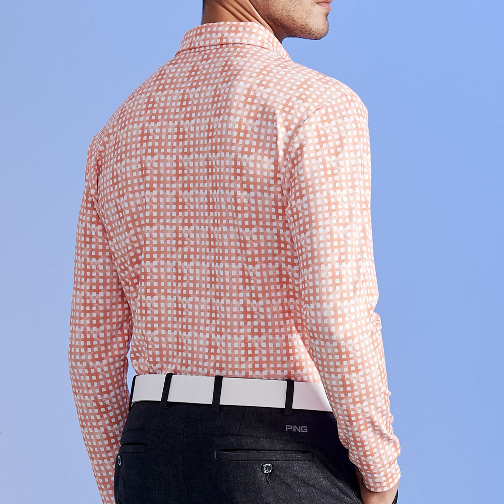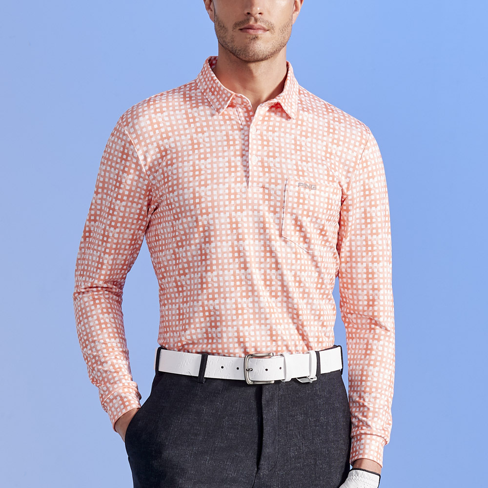 【PING】男款水彩格吸濕排汗口袋款薄長袖POLO衫-粉橘 / PA23203-25