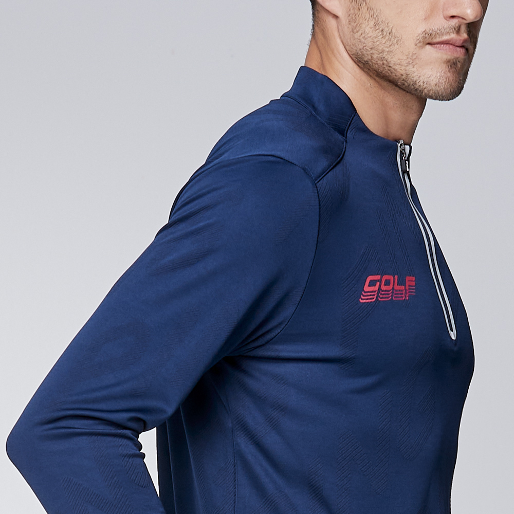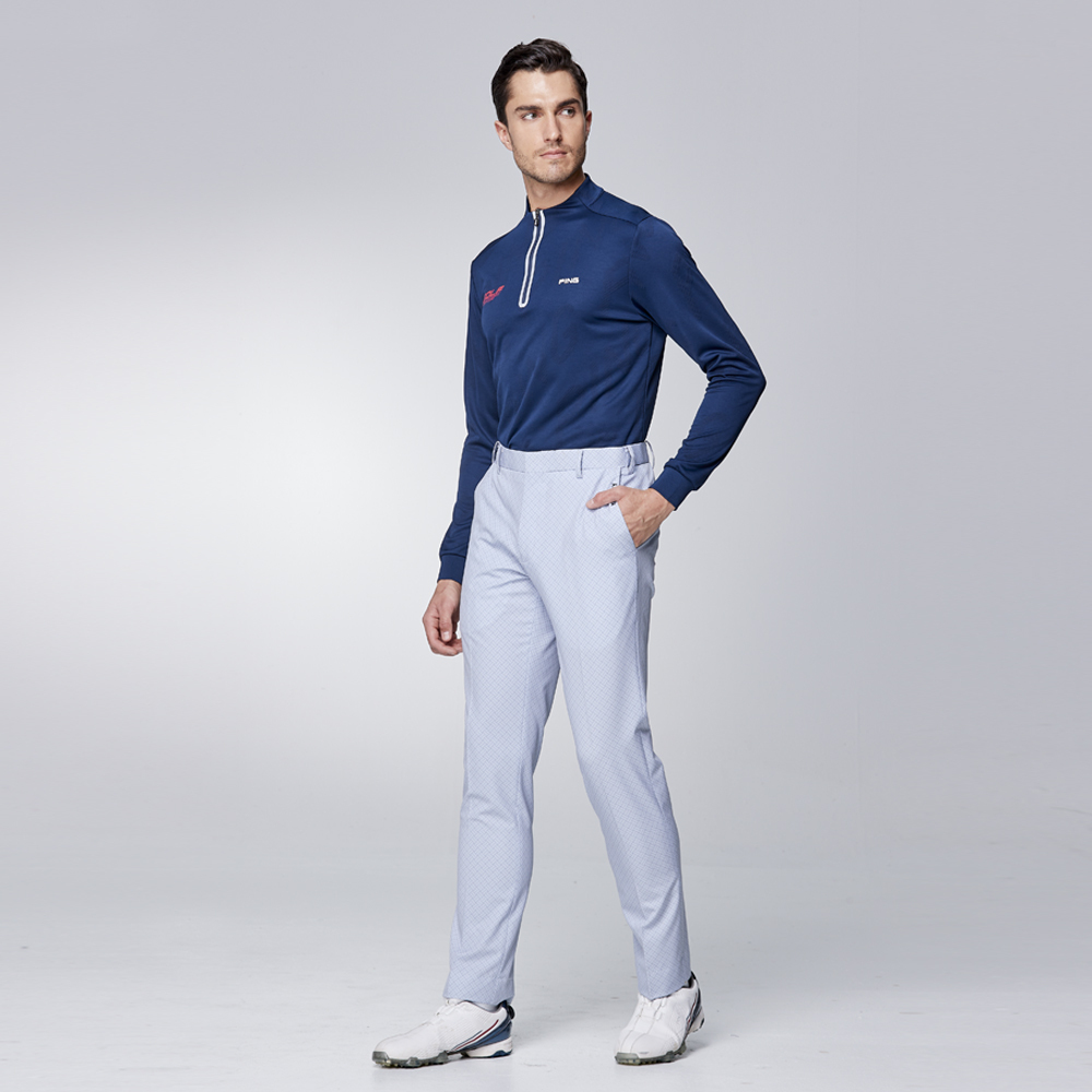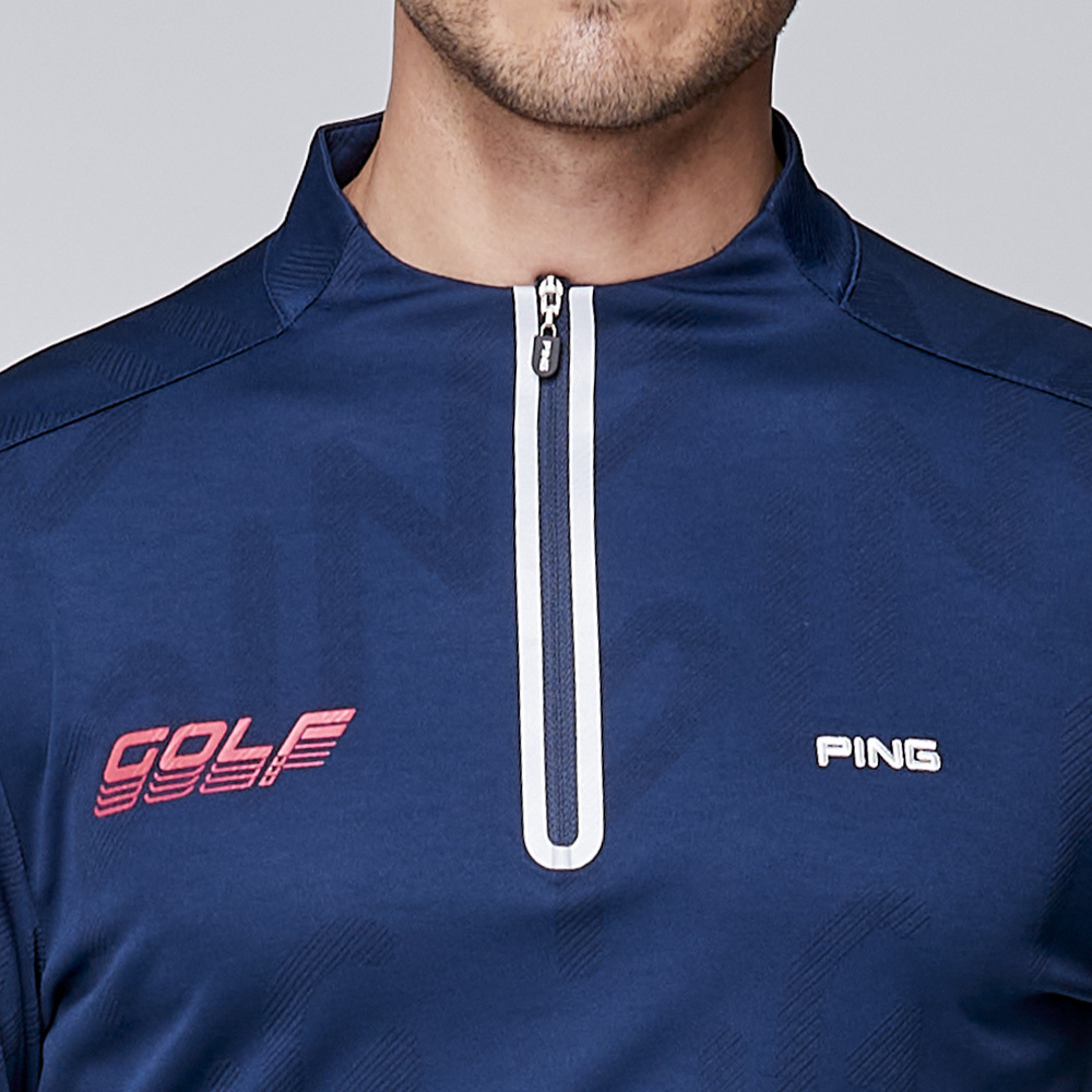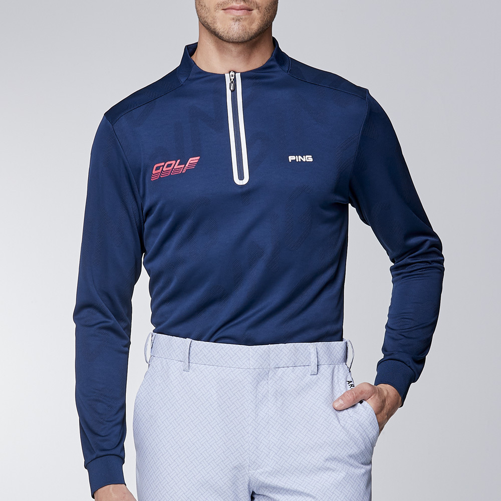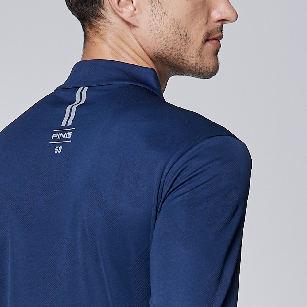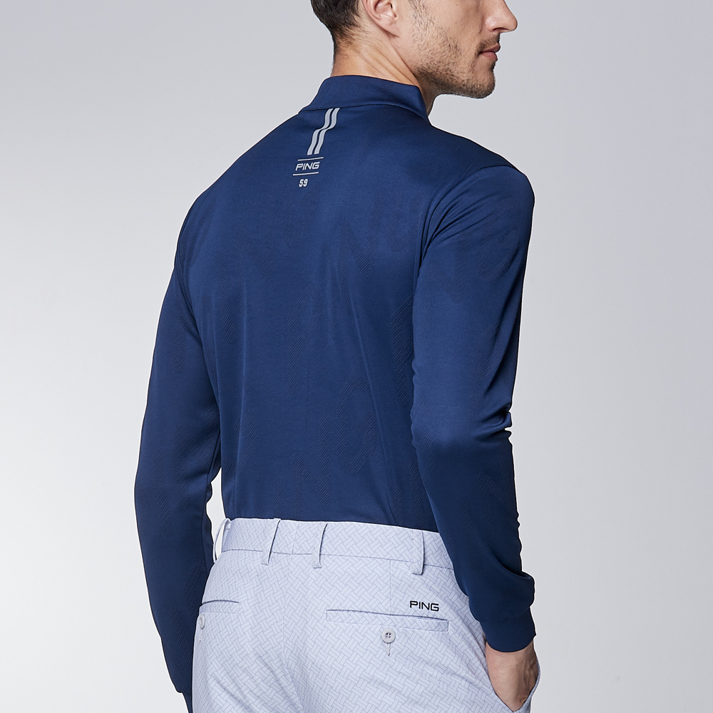 【PING】男款LOGO緹花吸濕排汗立領薄長袖POLO衫-深藍 / PA23220-58