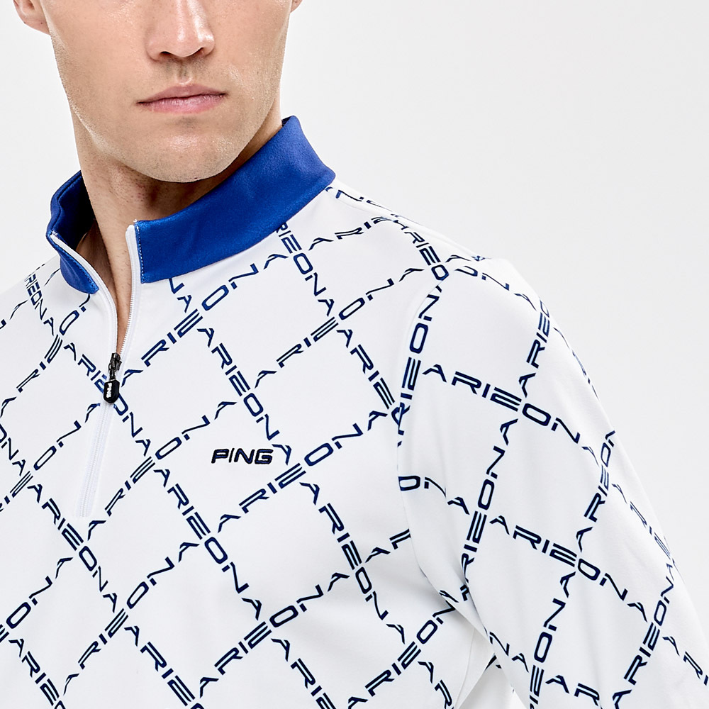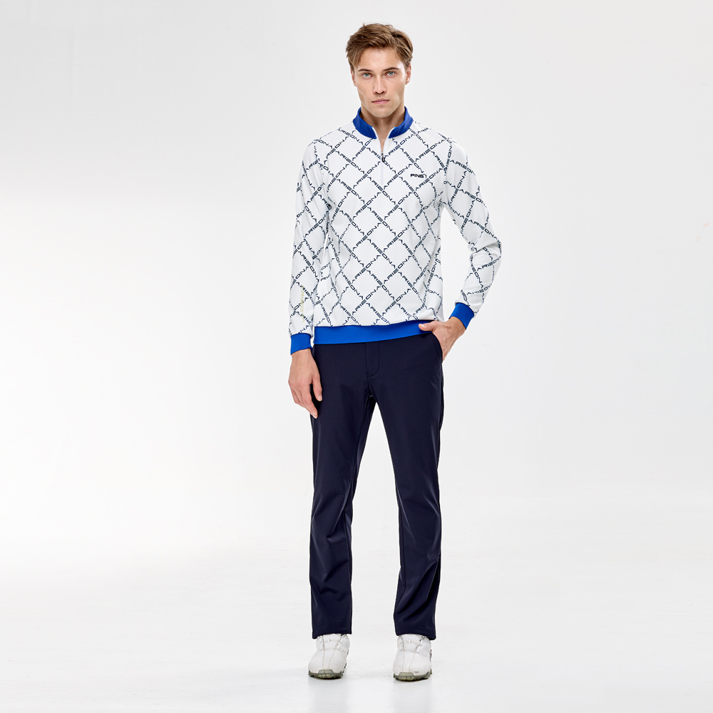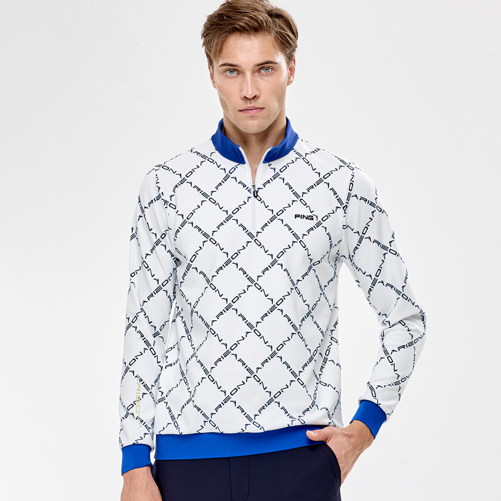 【PING】男款字體菱格紋長袖刷毛立領上衣-藍 / PA24225-56
