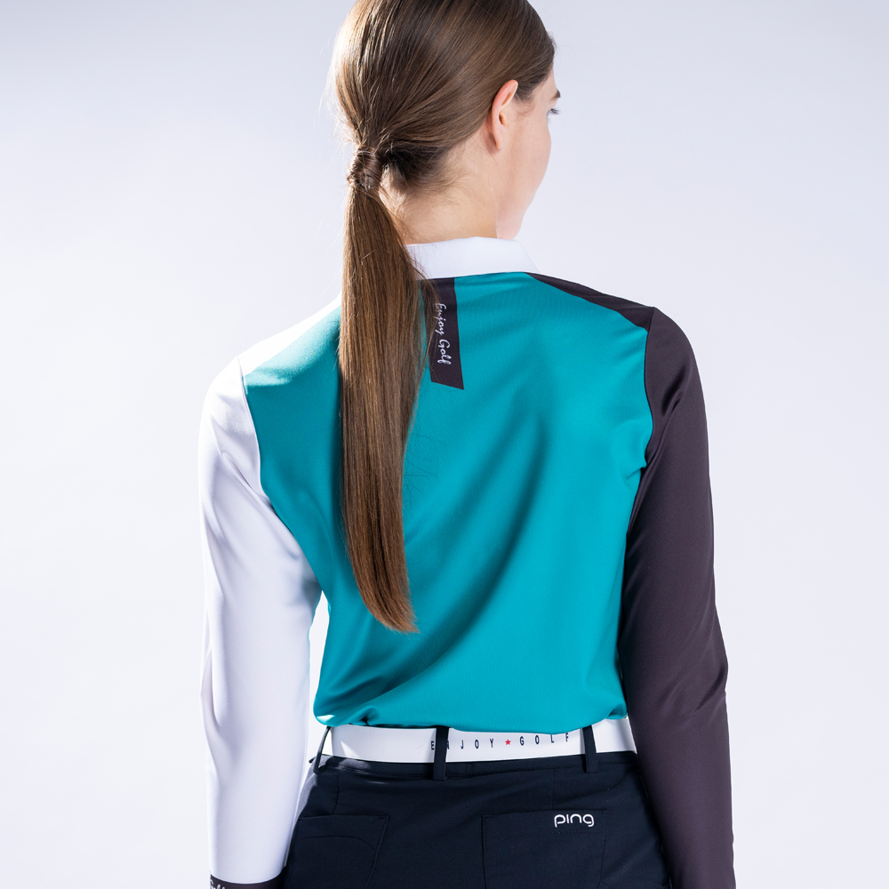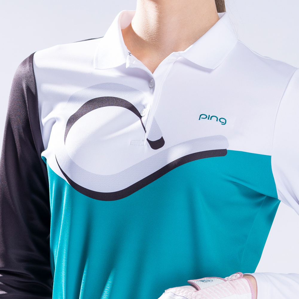 【PING】女款曲線印花剪接薄長袖POLO衫-綠 / RA22208-48