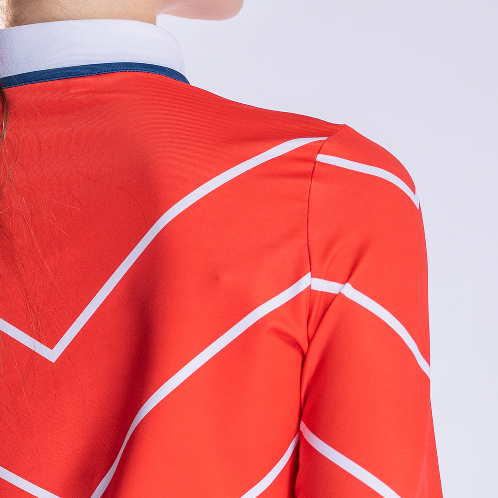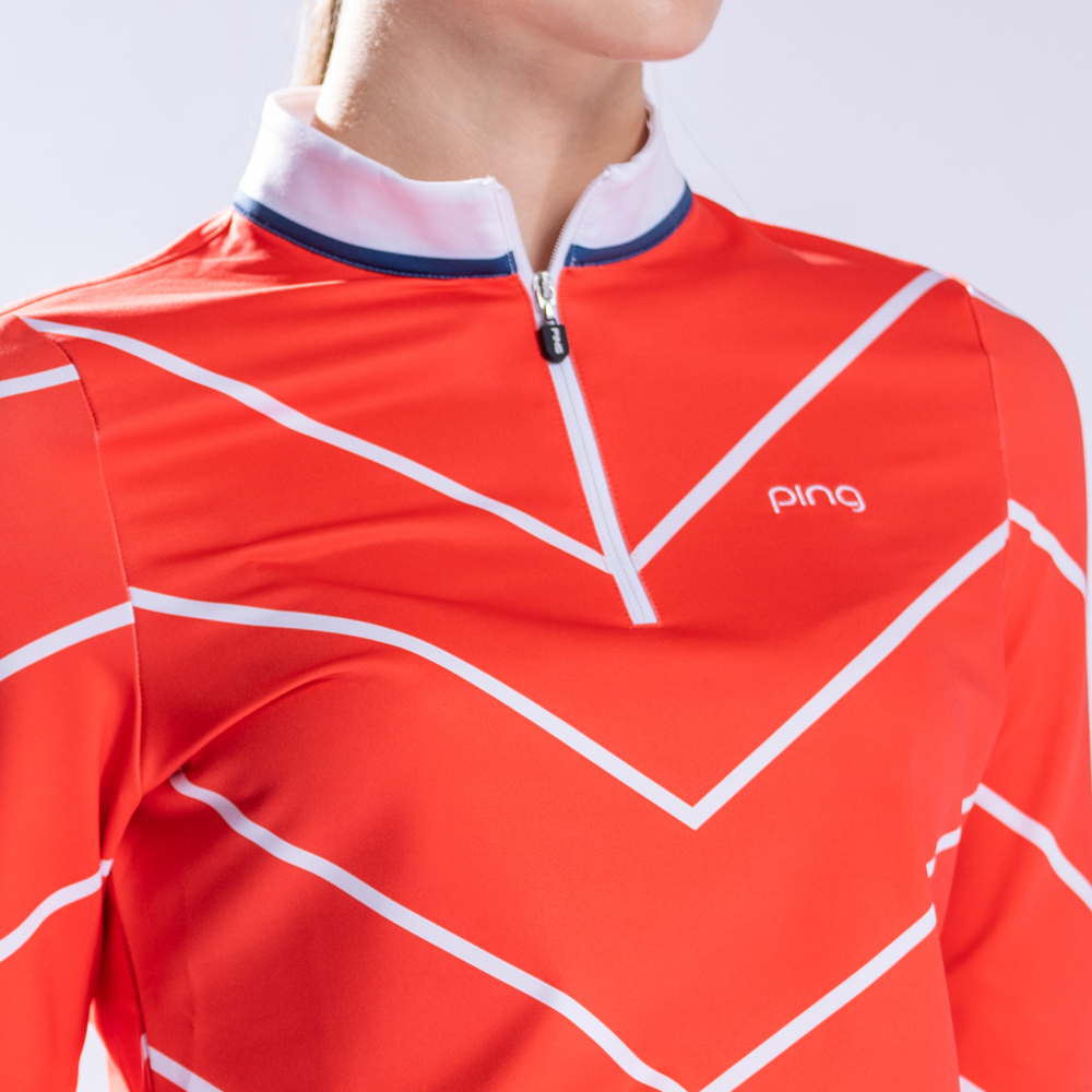 【PING】女款V循環條立領長袖POLO衫-橘 / RA22211-28