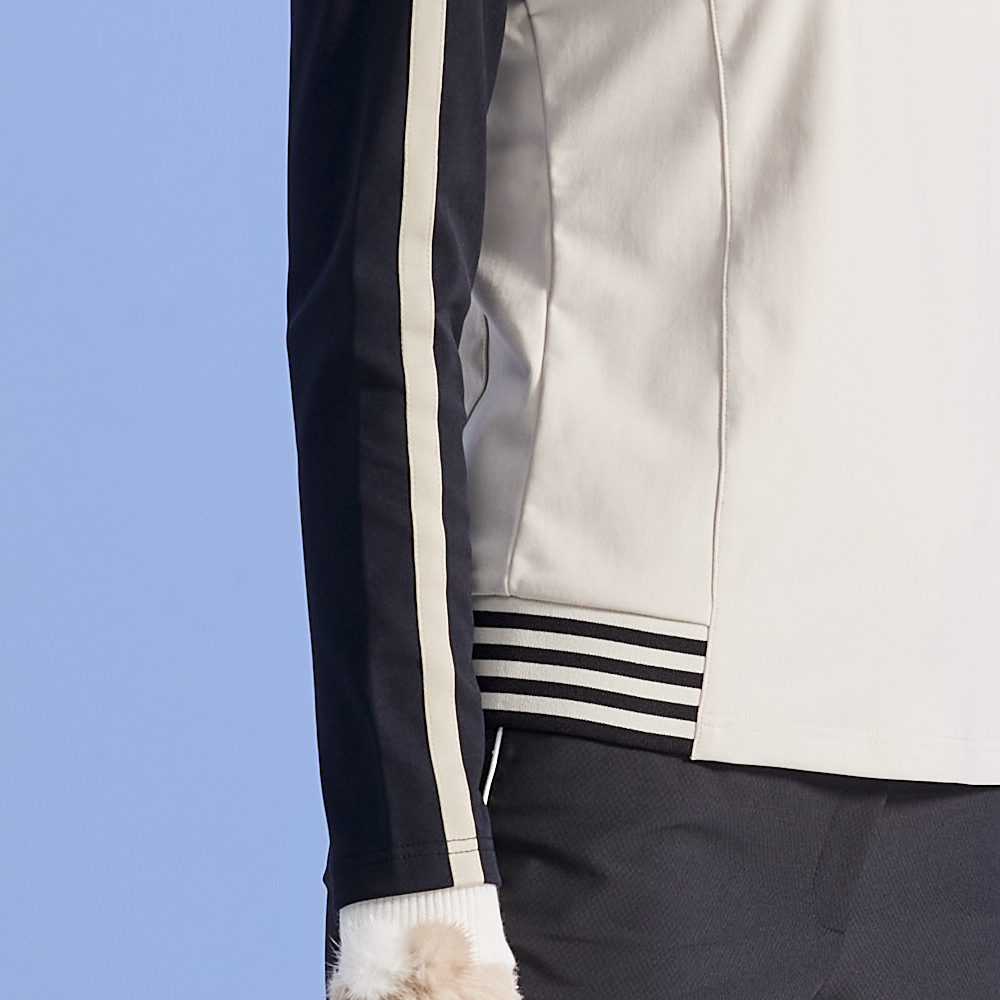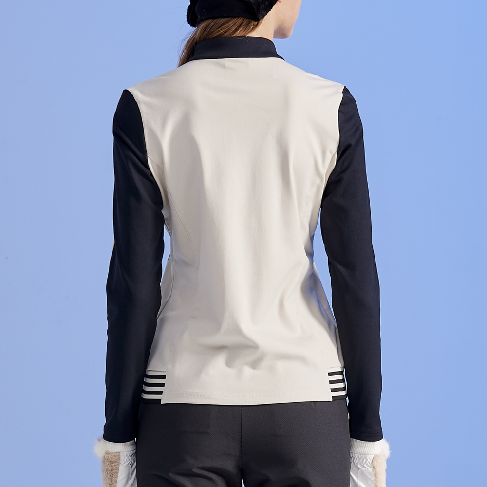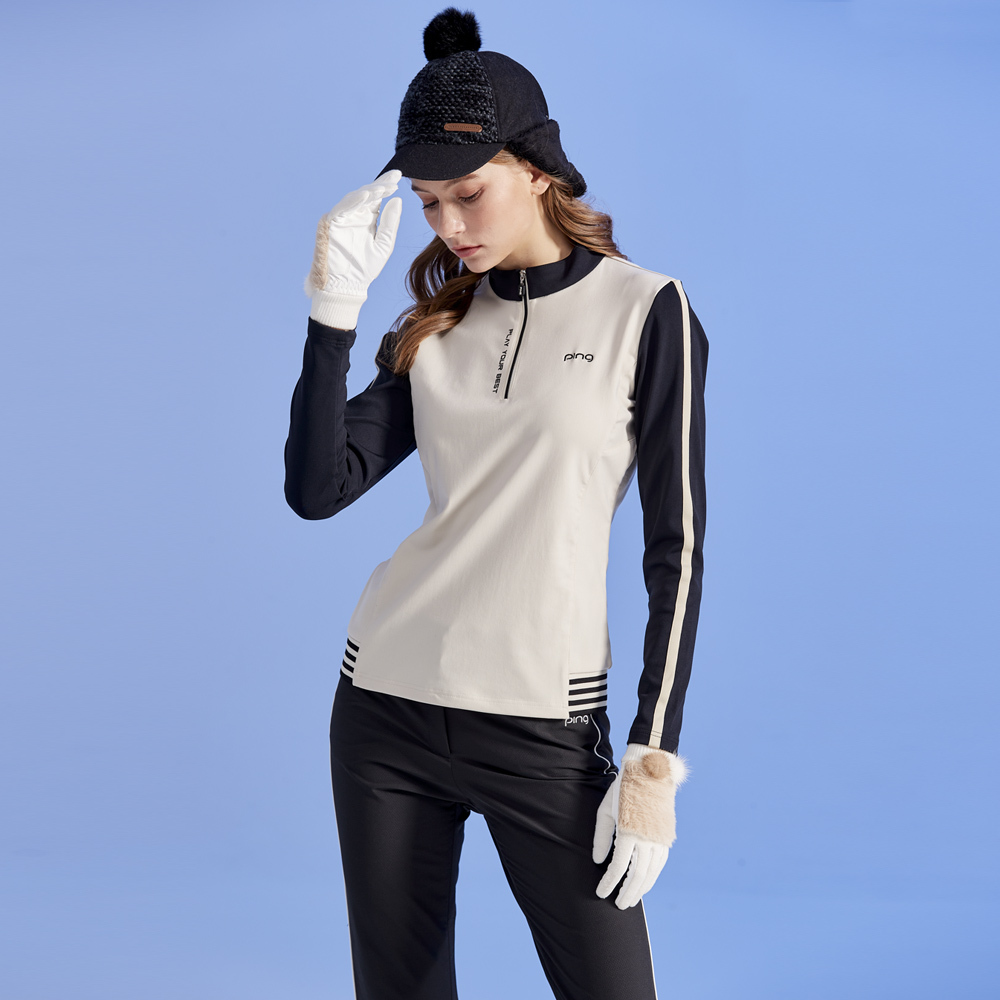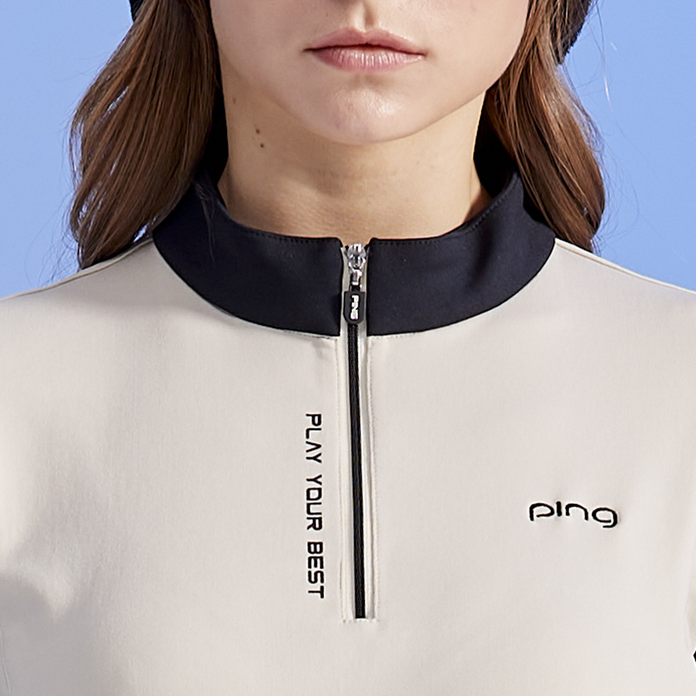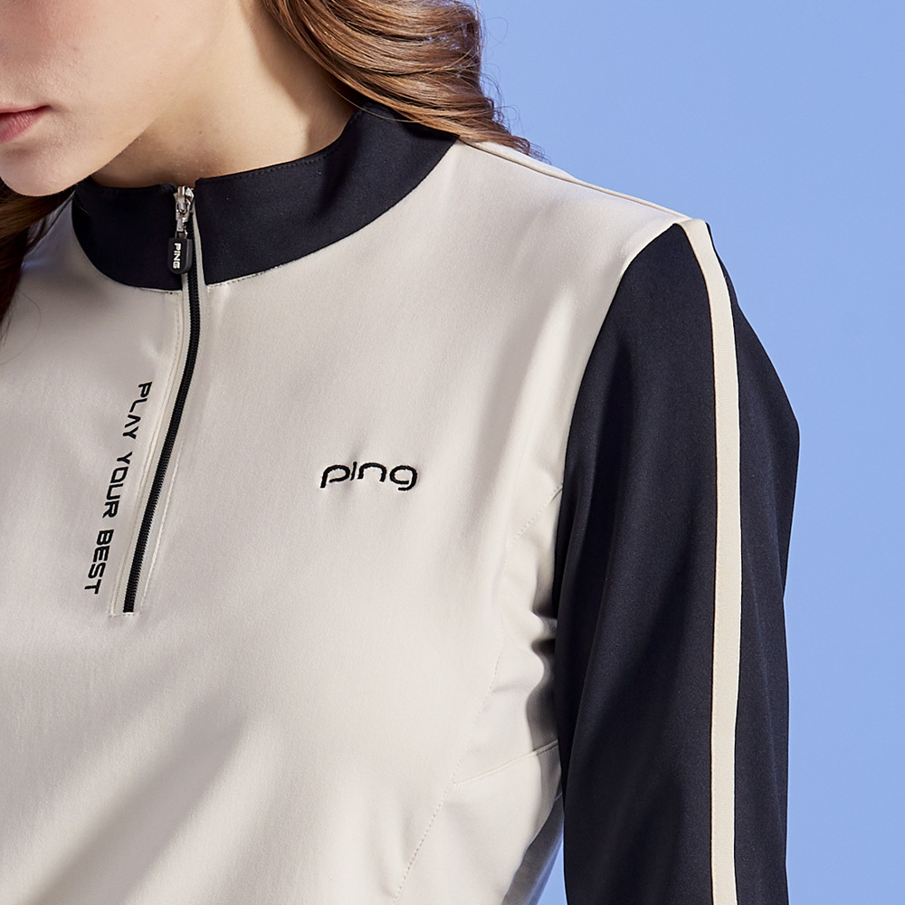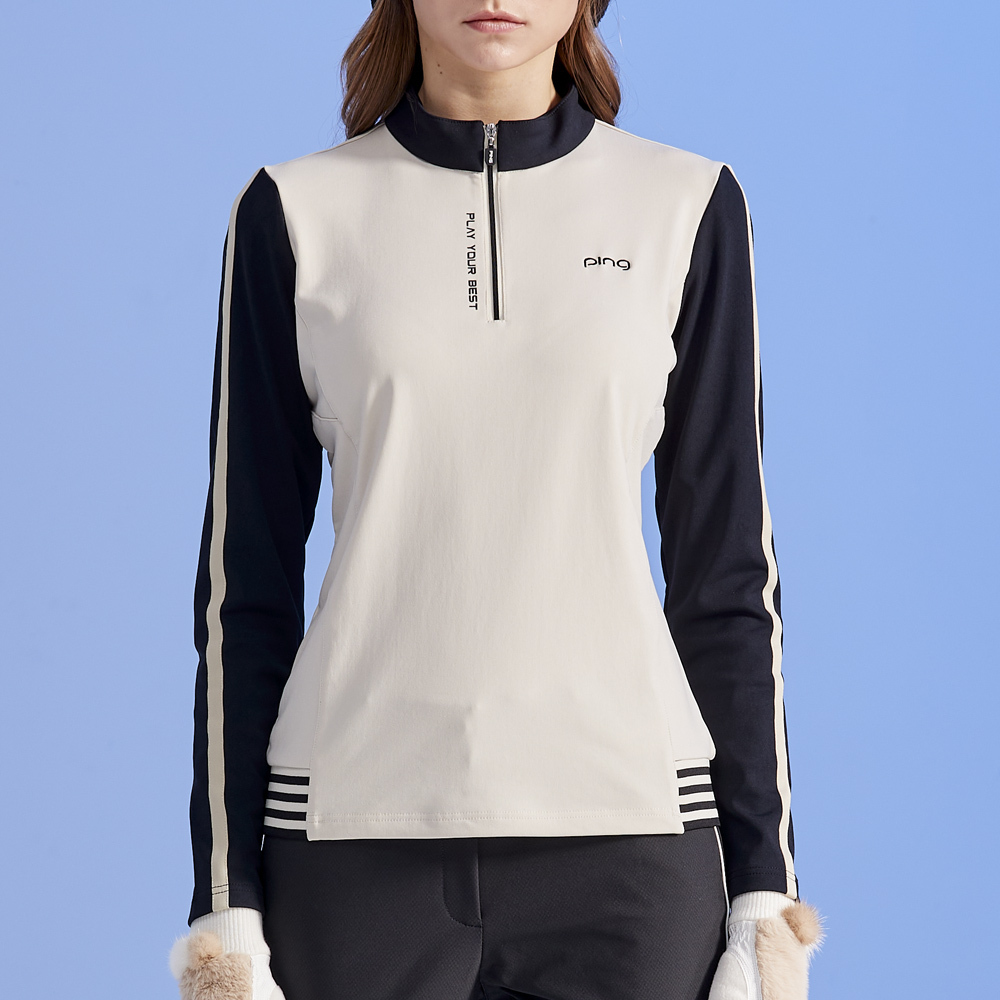 【PING】女款素面配色剪接立領長袖POLO衫-卡其 / RA23212-75