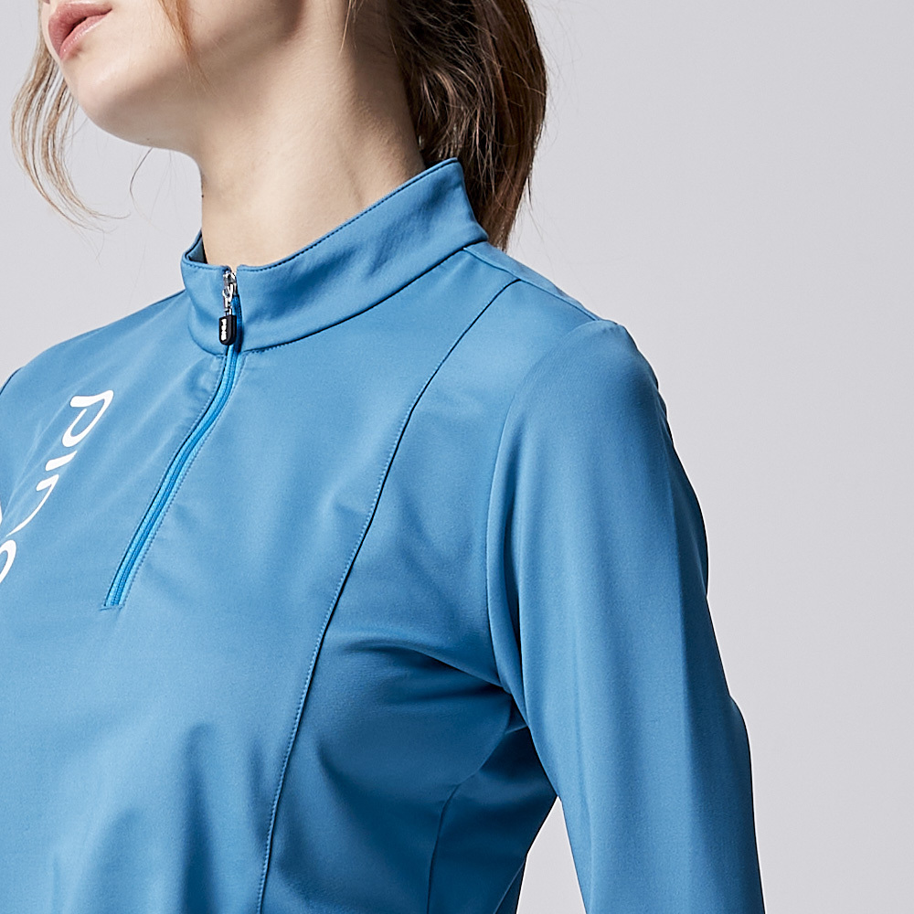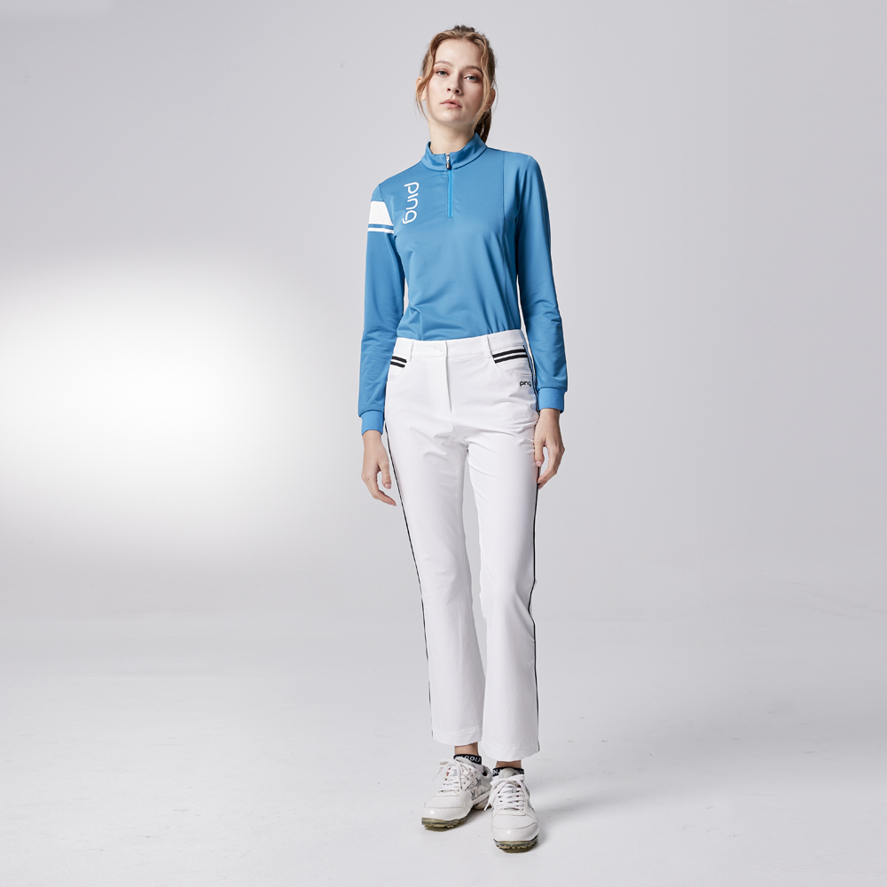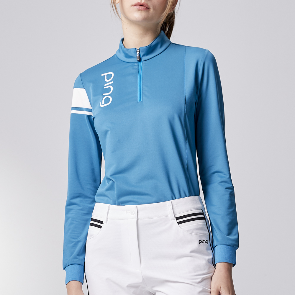 【PING】女款LOGO剪接運動立領長袖POLO衫-藍 / RA23217-56