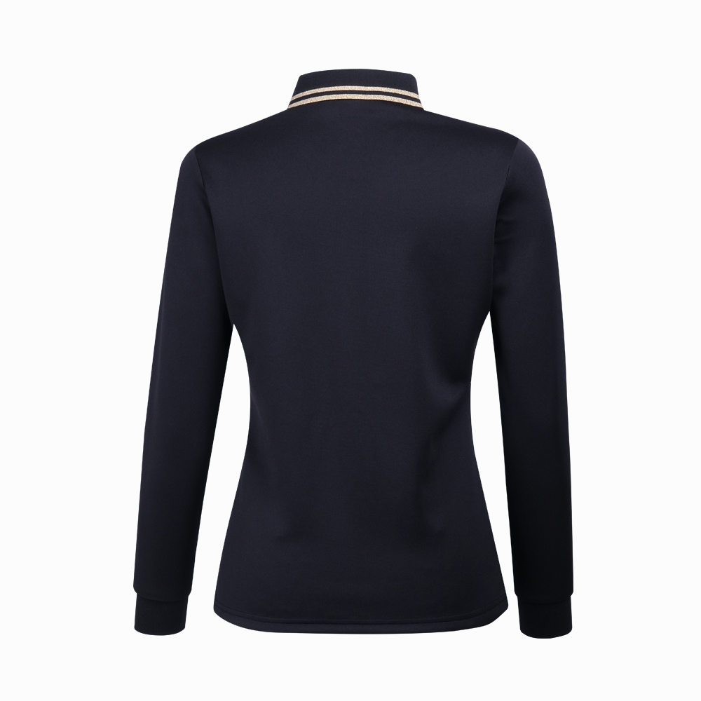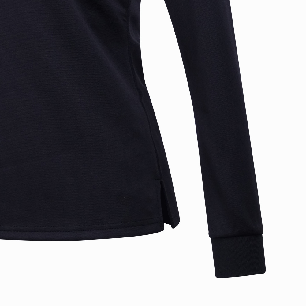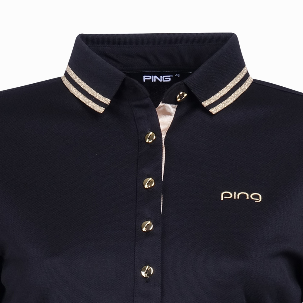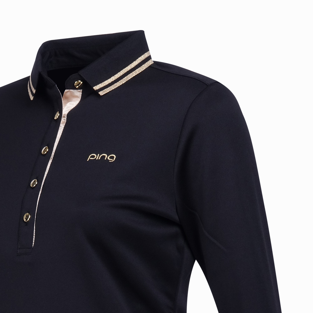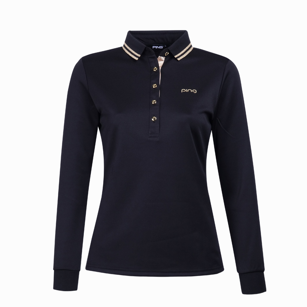【PING】女款條紋領素面吸濕排汗薄長袖POLO衫-黑 / RA23290-88