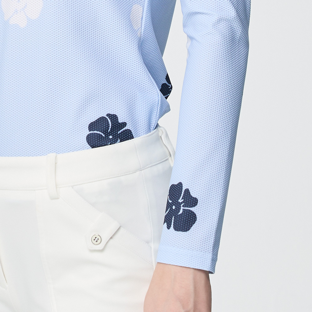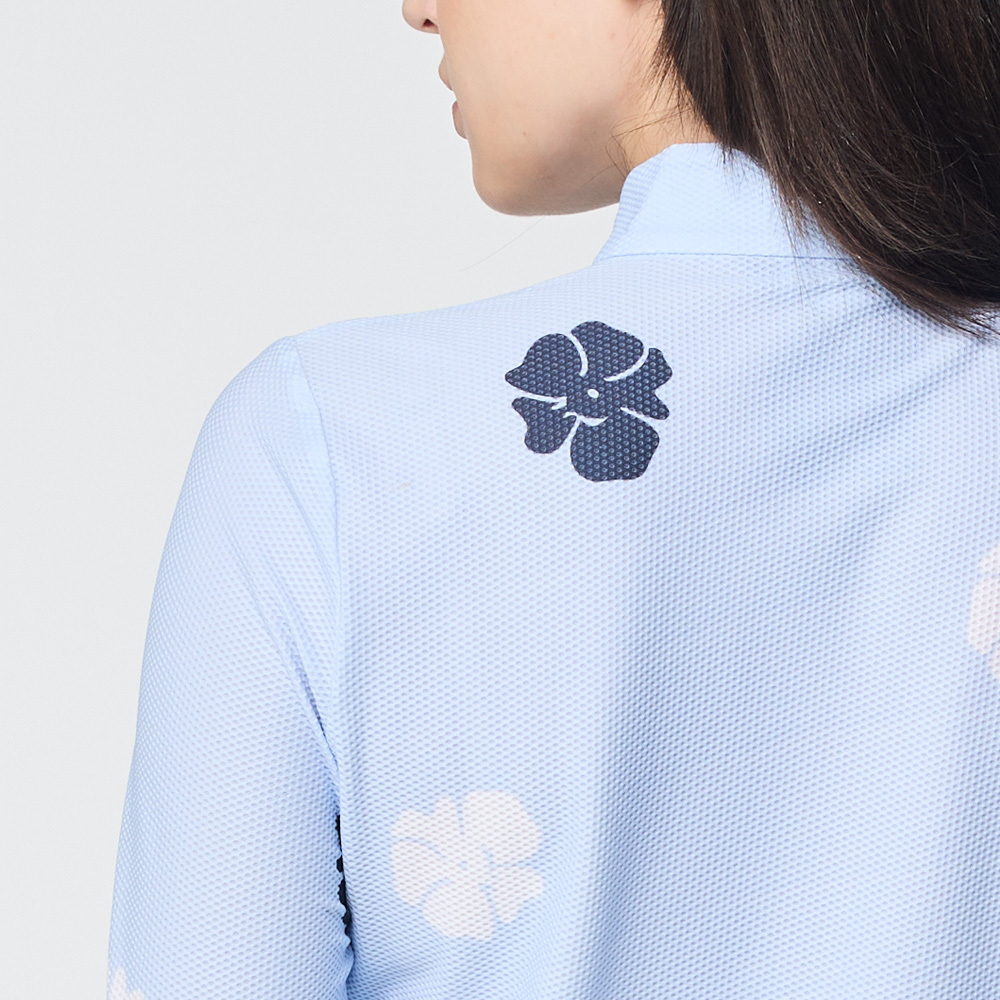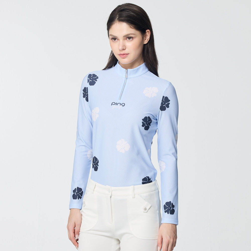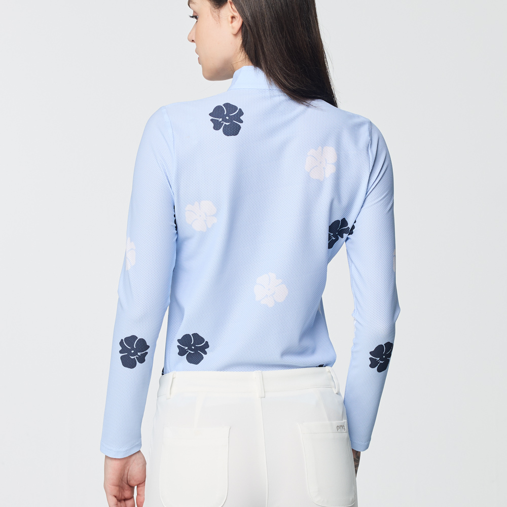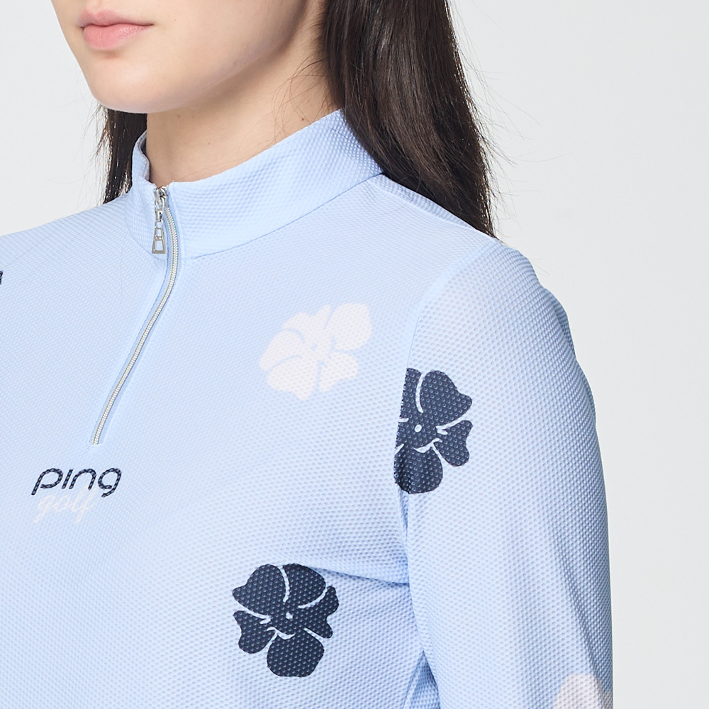【PING】女款花朵網眼薄長袖立領上衣-藍 / RA25214-55