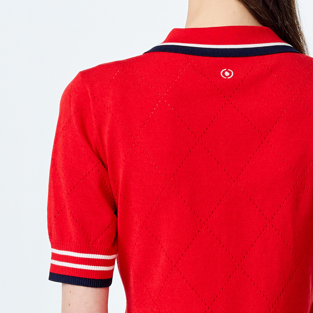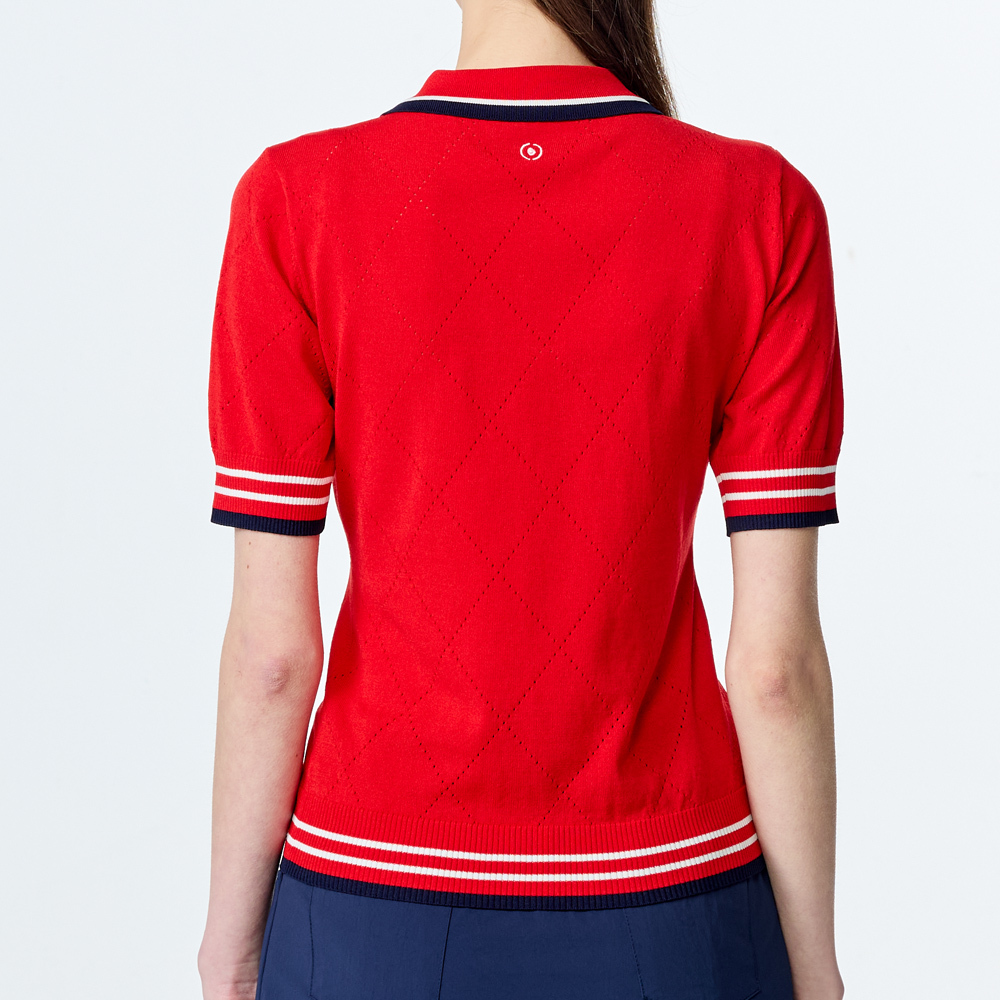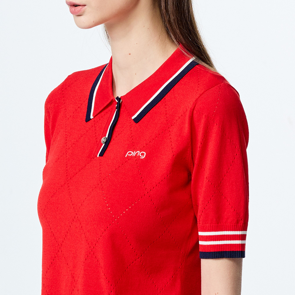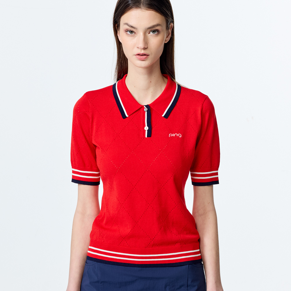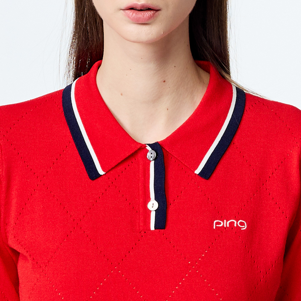 【PING】女款翻領菱格休閒薄款針織衫-紅 / RH25120-18